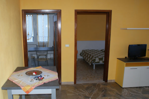 TRILOCALE 7 PERSONE: Trilocale di circa 55 mq, adatto ad ospitare 7 persone. Composto da soggiorno con divano letto matrimoniale, letto a ribalta, due camere matrimoniali o doppie, una senza porta di separazione, la seconda con entrata separata (senza collegamento con con il soggiorno e le altre stanze se non tramite balcone), angolo cottura, 2 bagni con doccia e un balcone.