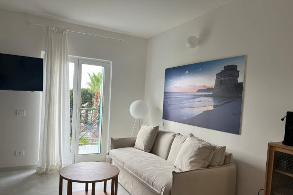MONOLOCALE 4 PERSONE BALCONE: Luminoso monolocale di 41 mq. L'appartamento dispone di una pratica cucina che si apre su una spaziosa stanza che funge sia da camera da letto che da soggiorno, dove vi è un comodo letto king size, divano letto e TV a schermo piatto, perfetto per i momenti di relaxDue bagni, di cui uno di servizio, e un balcone con vista mare, ideale per godersi il paesaggio. Dotato di tutti i comfort necessari, come lavastoviglie, lavatrice, Forno a microonde, aspirapolvere, asse e ferro da stiro e cassaforte: questo monolocale è la scelta perfetta per chi alla ricerca di un soggiorno pratico e rilassante.