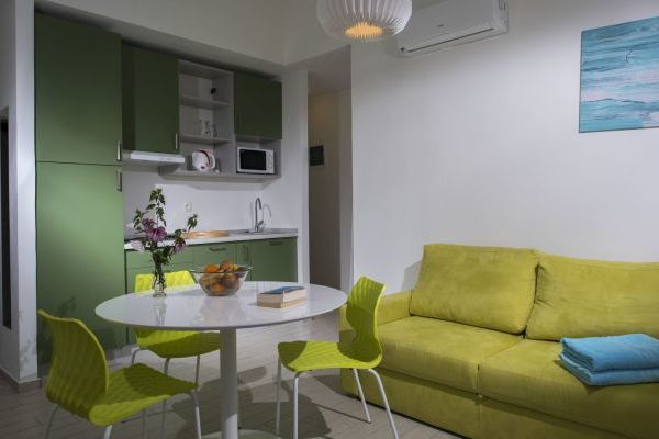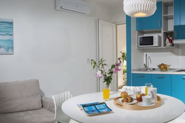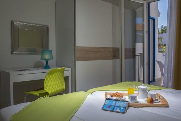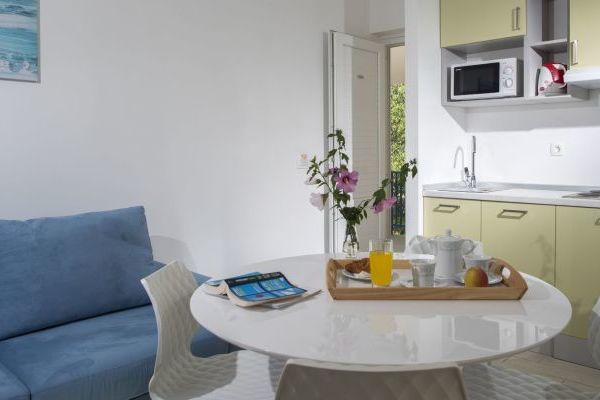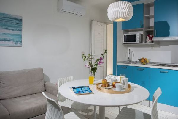 Appartamento tipo A (Vinea): camera doppia e soggiorno con angolo cottura attrezzato e divano letto per 2 persone, bagno con doccia e asciugacapelli, balcone o terrazzo. Aria condizionata, frigobar, cassaforte, TV-Sat, telefono, Wi-Fi gratuito, teli piscina.
