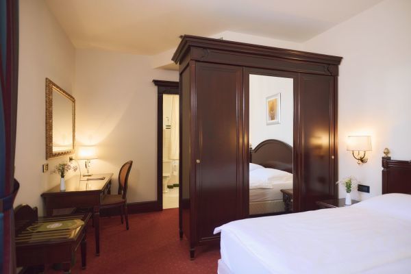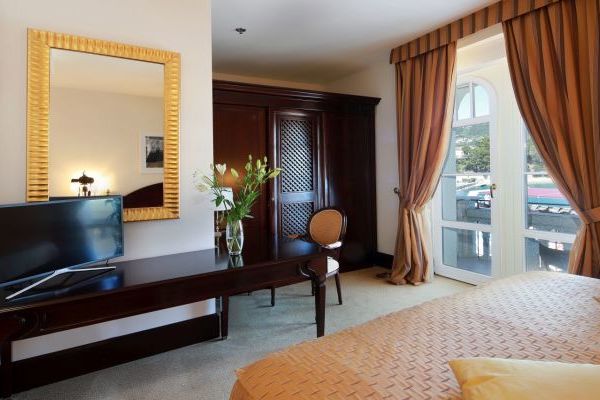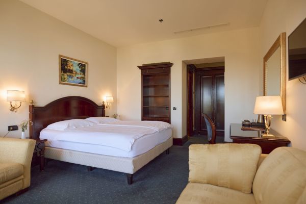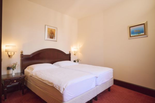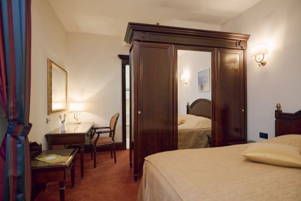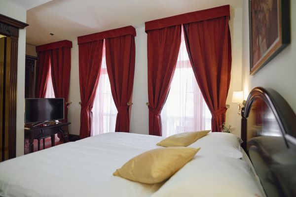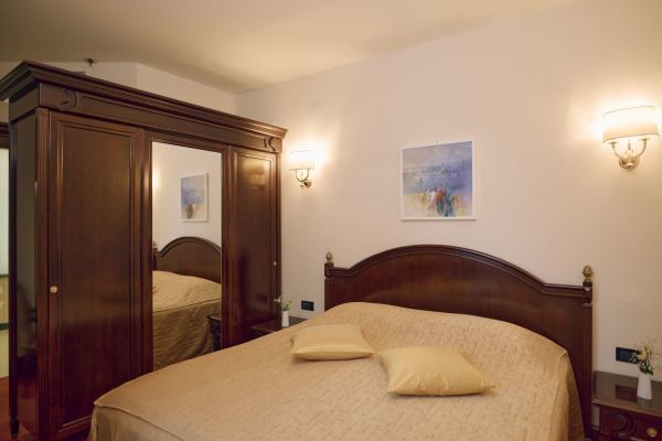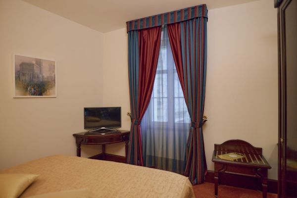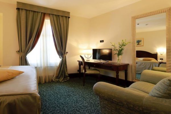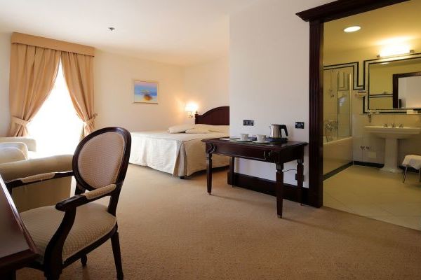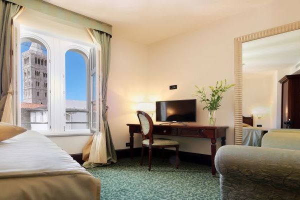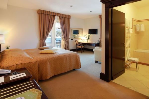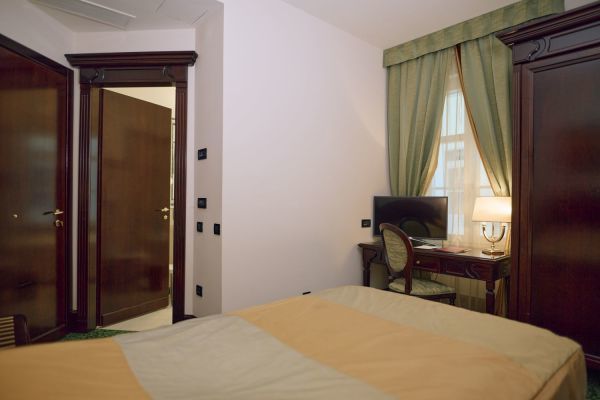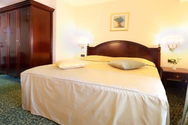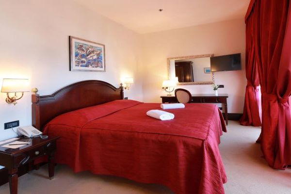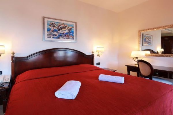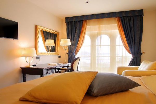 Camera Matrimoniale o Doppia Standard: spaziose ed elegantemente arredate, le camere matrimoniali standard offrono una vista sul curato parco mediterraneo e sul centro storico. 23-26 mq, letto king size 180x200 cm o due letti singoli 90x200 cm ciascuno.