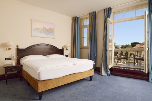 Camera doppia Superior con balcone: le confortevoli camere doppie Superior dispongono di balcone con vista sullo splendido e curato parco mediterraneo. 23-26 mq, letto king size (180x200 cm).