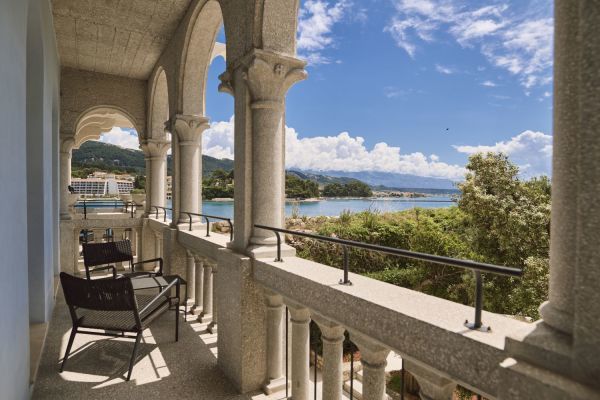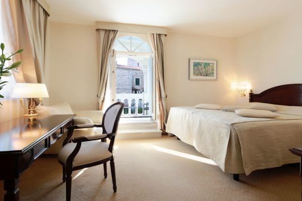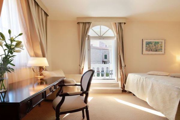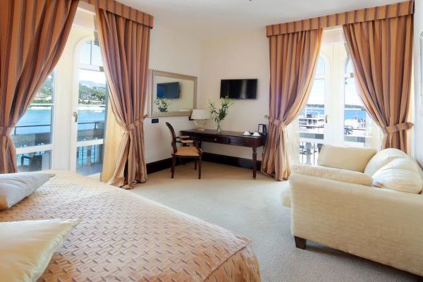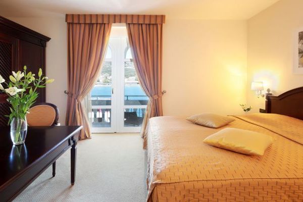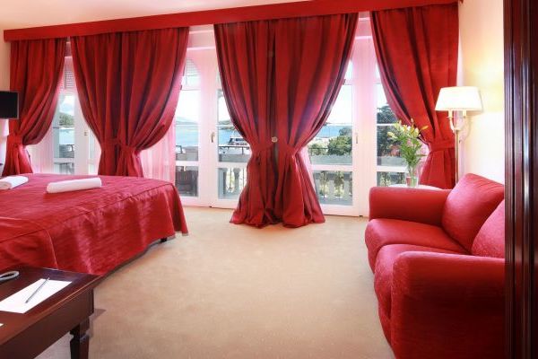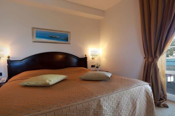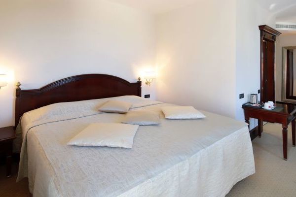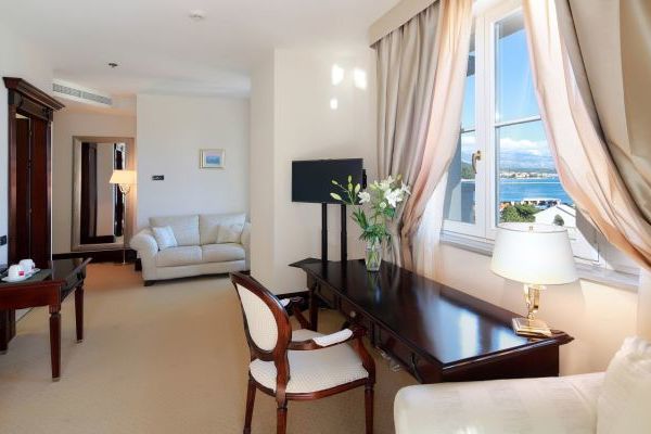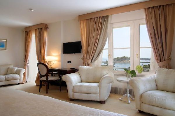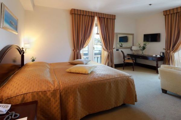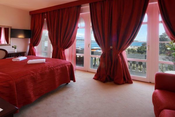 Camera doppia Deluxe con balcone, vista mare: oltre ad arredi eleganti e dettagli accuratamente selezionati, offre una vista spettacolare sul mare e sull'orizzonte, sui campanili della città e sul curato parco mediterraneo. 24-32 mq, con letto king size (180x200 cm). Su richiesta divano (100x180 cm) per un bambino.