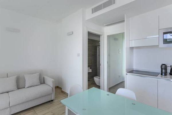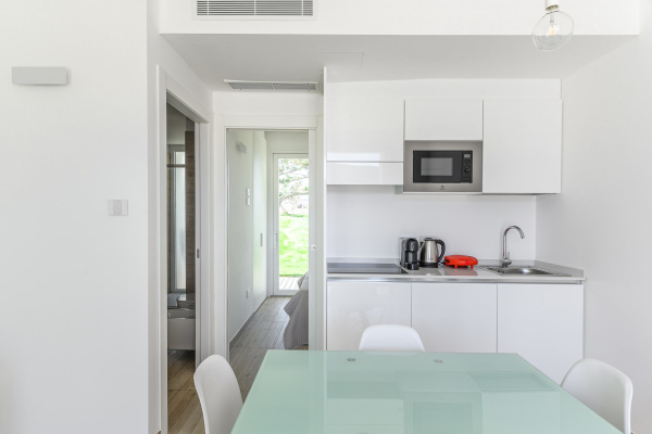 B4 - Appartamento monolocale (4 persone) COMFORT (38 mq): Soggiorno con angolo cottura (2 piani cottura a induzione), minifrigo, divano letto (180 cm), camera matrimoniale, bagno con doccia.