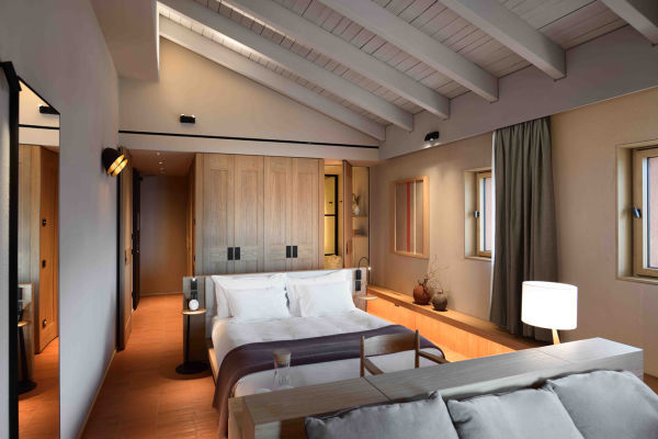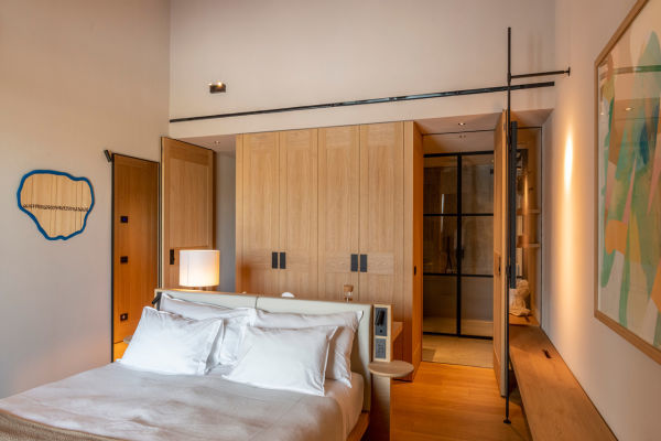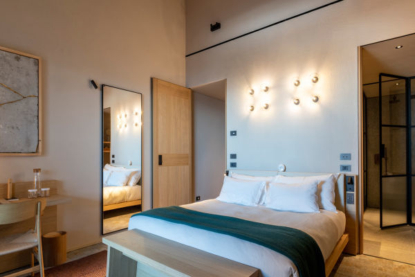 Dotato di un suggestivo camino a vapore acqueo interamente sostenibile e di un moderno letto a baldacchino in legno realizzato da maestri artigiani, le Suites Monviso presentano inoltre un ampio angolo doccia con getto a effetto pioggia, una vasca da bagno di design e un doppio lavabo.