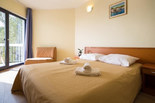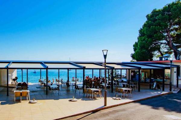 La spiaggia più vicina è di ghiaia e roccia, con un'ombra naturale di pini. È possibile noleggiare sedie a sdraio e ombrelloni in spiaggia o dedicarsi ad attività come kayak, SUP o altre attrazioni acquatiche.