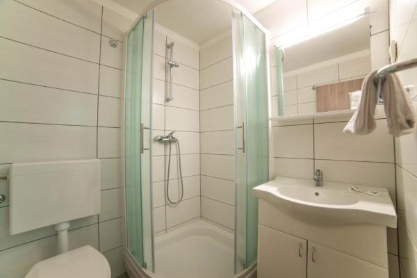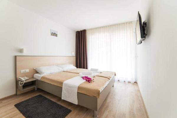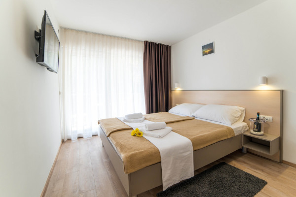 La spiaggia più vicina è di ghiaia e roccia, con un'ombra naturale di pini. È possibile noleggiare sedie a sdraio e ombrelloni in spiaggia o dedicarsi ad attività come kayak, SUP o altre attrazioni acquatiche.
