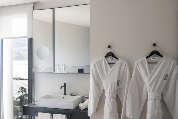 DOPPIA DELUXE VISTA MARE: La Camera Deluxe è ideale per chi desidera un soggiorno all'insegna del comfort. Situata tra il primo e il quinto piano dell'hotel, questa camera con una superficie di circa 25/29 m², con una bellissima vista mare, può ospitare fino a due persone. È disponibile con letto matrimoniale king-size o con letti separati (twin) a seconda delle preferenze degli ospiti. Gli interni sono caratterizzati da linee essenziali e una palette di colori naturali, con tocchi di stile che conferiscono un'atmosfera raffinata e rilassante ed è dotata di aria condizionata, Wi-Fi gratuito, smart TV LCD, minibar, cassaforte, macchina per il caffè e bollitore, per garantire un soggiorno piacevole e senza pensieri. Il bagno è completo di asciugacapelli, set di cortesia e pantofole, per offrire un'esperienza di benessere anche in camera.