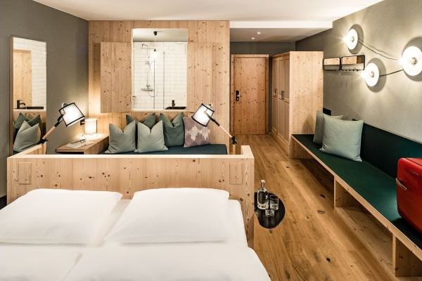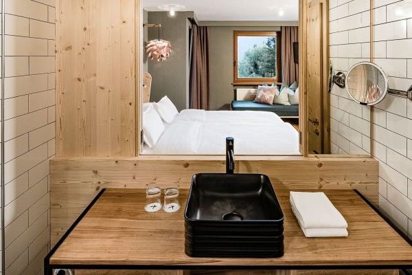 Junior Suite Deluxe con Loggia: la Junior Suite Deluxe di circa 30-35 m² con vista sulle montagne o sulla foresta offre spazio per 2 adulti. La camera dispone di un letto a molle, di un'accogliente loggia romantica, di un balcone con vista sulle montagne o sulla foresta e di un nuovo bagno.