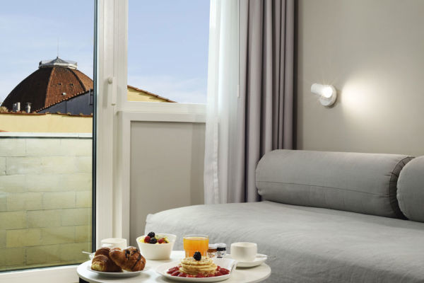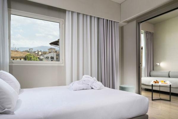 Camera Junior Suite UP con ColazioneMax. 3 OspitiSituata all'ultimo piano, offre affacci esclusivi sui tetti di Firenze. Camera con letto king size (o 2 letti singoli) e salottino separato con letto singolo.