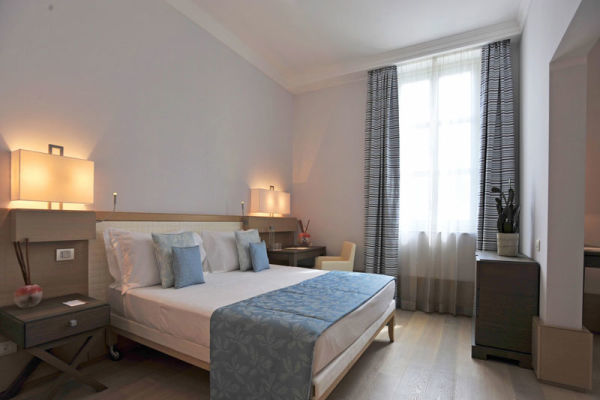 DOPPIA SUPERIOR VISTA ALASSIO: Affacciata sulle ridenti colline di Alassio, camera per 2 persone arredata con eleganza per esaltare il pittoresco paesaggio fatto di alberi e belle dimore variopinte. Le calde venature del legno, il candore dei marmi della Calizia, il blu e il celeste dei tessuti creano sorprendenti armonie cromatiche creando un ambiente sereno e accogliente.