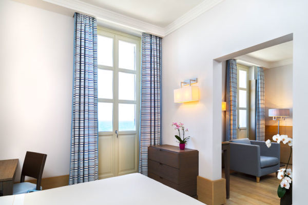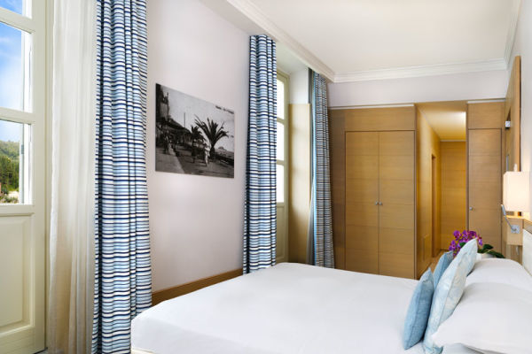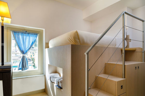QUADRUPLA DE LUXE FAMILY PLAN: Camera spaziosa che si affaccia sul mare oppure sulle verdi colline di Alassio. L' interior design è un omaggio allo stile della tradizione marinara, declinata nelle forme e nei colori degli arredi e dei tessuti, esaltata dalla raffinata semplicità dei materiali naturali. Queste stanze sono particolarmente adatte per le famiglie o gruppi di amici; infatti alcune di loro possono essere rese comunicanti con delle camere Superior, mantenendo gli ingressi separati.