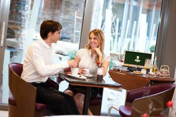 un’accogliente caffetteria con un ottimo caffè e un atrio verde,