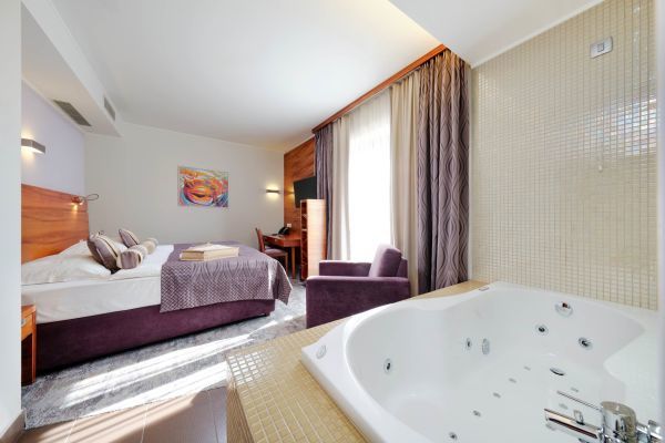 Camera doppia con jacuzzi: letto matrimoniale, vasca idromassaggio in camera, bagno privato (doccia/vasca), balcone alla francese. 31 mq.