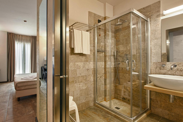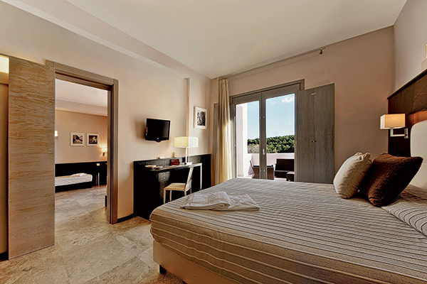 Camere eleganti e raffinate, dotate di ogni comfort, aria condizionata, telefono, TV, wifi, cassetta di sicurezza, minibar (attrezzato su richiesta). Disponibili camere Standard (1/2 posti letto) unico ambiente, alcune con balcone/patio, adiacenti al corpo centrale dell’Hotel, vi si accede attraverso un percorso esterno e ascensore o scala; Superior (2/4 posti letto) unico ambiente nel corpo centrale con letto matrimoniale e 1 letto singolo o castello, molte con balcone e la maggior parte con vista piscina; Suite con doppio ambiente (2/4 posti letto) nel corpo centrale dell’Hotel con camera d’ingresso con divano letto e camera matrimoniale, con supplemento da calcolare sulla tariffa superior; Suite con vasca idromassaggio (2+1 posto letto) unico ambiente con vasca idromassaggio in camera, con supplemento da calcolare sulla tariffa superior, che comprende: 2 accappatoi, cesto di frutta e prosecco all’arrivo, fornitura minibar e percorso benessere in SPA (90 min). Tra le Superior, 2 camere sono attrezzate per diversamente abili. Tutti i bagni sono dotati di doccia con box.