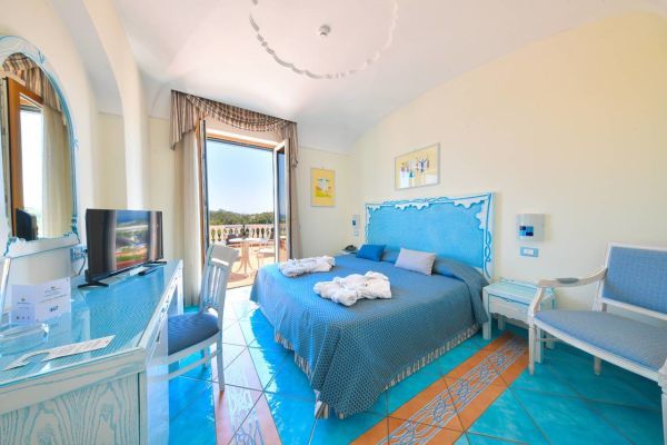 52, dotate di servizi privati con doccia, phon, telefono, tv sat, Wi-Fi, aria condizionata (15/06 - 15/09) e riscaldamento. Si suddividono in: standard (doppie, triple e quadruple), la maggior parte con balcone e ubicate tra il piano terra ed il 1° piano; superior (doppie, triple e quadruple), ubicate dal 2° al 4° piano e nella “Villa” a 10 m, recentemente rimodernate, tutte con balcone, cassaforte e frigobar; superior vista panoramica con balcone/terrazzo (doppie e triple), ubicate tra il 2° e il 4° piano; junior suite (doppie), situate al 4° piano, molto spaziose e con area soggiorno.