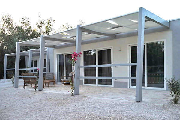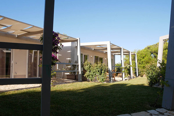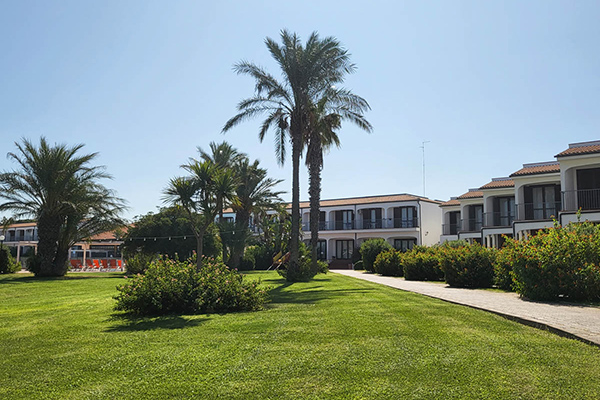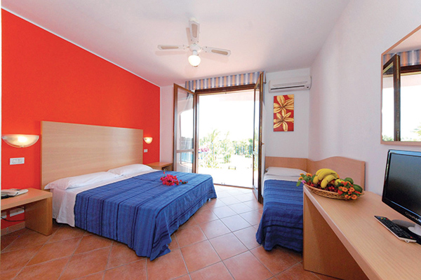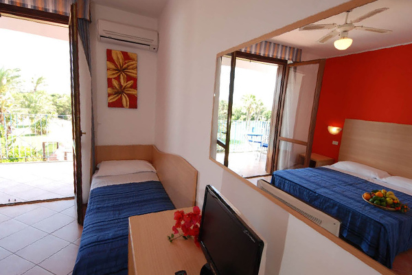 armoniosamente inserito in un'area verde di 90.000 mq., si compone di un grazioso corpo centrale a 2 piani che si sviluppa lungo la piscina olimpionica e 3 blocchi laterali dove si trovano le camere standard. Percorrendo l'area piscina, lungo un vialetto che porta al mare, si incontrano la maggior parte delle nuovissime villette doppio vano e l'area sportiva. Camere Standard: 160, in stile mediterraneo, dispongono di servizi con asciugacapelli, telefono, aria condizionata, minifrigo, televisore, patio se al piano terra, terrazzino se al primo piano, bagno con box doccia rinnovato e ampliato in tutte le camere. Possono essere doppie/matrimoniali (dotate solo di porta-finestra), triple o quadruple (queste ultime tutte con letto a castello, letti bassi su richiesta e previa disponibilità), camere quintuple su richiesta e previa disponibilità (camere quadruple adattate a quintuple); non disponibili camere comunicanti; possibilità di sistemazione in camere lato piscina (con supplemento in loco). Le segnalazioni circa l’assegnazione della camera non sono garantite e dipendono dalla disponibilità dell’albergo; cambio camera a pagamento Euro 25 a camera. Villette ecosostenibili di due tipologie: camere familiari doppio vano di 30mq, piano terra. Dotate di mini-frigo, aria condizionata e zanzariere, due camere da letto, una matrimoniale e una doppia o tripla (terzo letto a ponte), un bagno finestrato con ampio box doccia e asciugacapelli; spazioso patio esterno attrezzato. Ogni camera da letto è dotata di porta finestra indipendente e tv a schermo piatto. Minimo 3 occupanti, massimo 5; per 3 occupanti minimo 2,5 quote paganti; per 3 adulti e 3 adulti e un infant 0/3 e 3 adulti ed 1 bambino 3-14 e 1 infant 0/3 anni 3 quote paganti. Camere unico vano con letto matrimoniale e letto singolo, bagno finestrato con ampia doccia, ampio patio esterno attrezzato con divanetto, tavolino e 2 poltroncine, tv a schermo piatto, mini-frigo, aria condizionata, nuova costruzione ecosostenibile a piano terra. Occupazione massima 3 persone, da considerarsi listino delle villette ma con riduzioni standard.