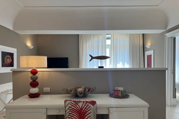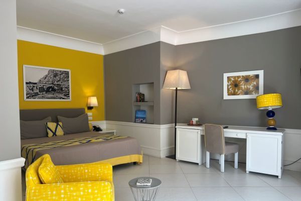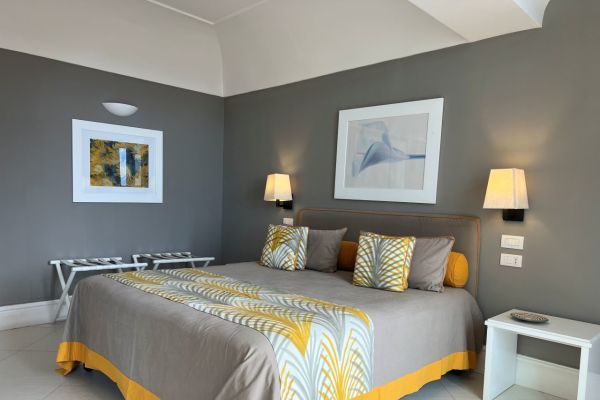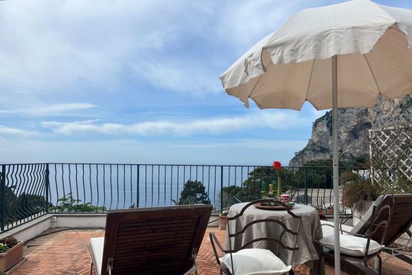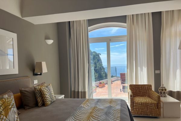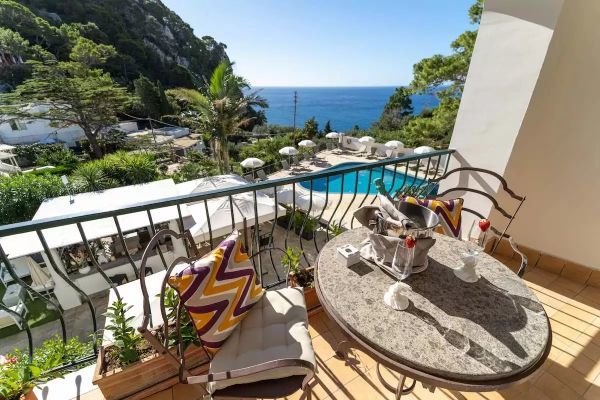 Deluxe con terrazzino vista mare: Lasciatevi avvolgere dalla magia di Capri, ammirando il mare dal vostro terrazzino privato. Qui, il tempo scorre lentamente, tra un momento di relax e un drink con l’orizzonte a far da sfondo. 23mq.