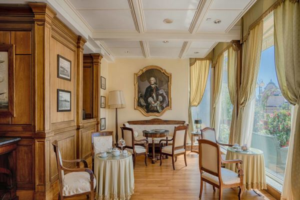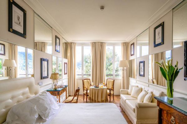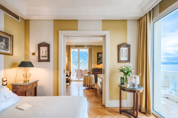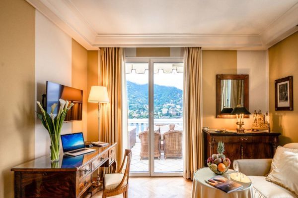 SUITE DE LUXE: Camera a partire da 60 mq, composta da ampia zona notte e sala soggiorno elegantemente decorate ed arredate con mobilio di antiquariato e quadri d'epoca autentici e ogni comfort. A disposizione Open Bar con scelta di liquori. Dispone di un ampio balcone/terrazzo con Jacuzzi ed incantevole vista mare sulla Baia di Rapallo e sul promontorio di Portofino. Questa tipologia può essere comunicante con una camera doppia su richiesta. Occupazione massima di 2 persone.