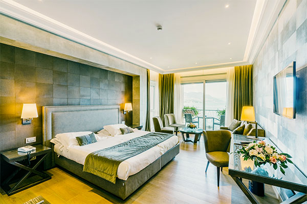 JUNIOR SUITE BALCONE VISTA LAGO FRONTALE : Camera con balcone di circa 35 mq, con vasca o doccia, phon, telefono diretto, minibar, Tv Sat, aria condizionata, angolo soggiorno, wi-fi, py per view con supplemento. Tutte le Junior Suite sono state rinnovate di recente con un design contemporaneo e ogni dettaglio è una piacevole scoperta. Il balcone si affaccia direttamente sul lago per godere della magica vista sulle Isole Borromee. Accappatoio e ciabattine icluse.