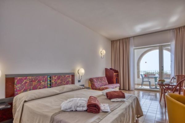 102, con servizi privati, vasca o doccia, phon, terrazzo o balcone, telefono, tv-sat, cassaforte (con deposito cauzionale), minibar e bollitore per tè e caffè. Aria condizionata e riscaldamento in funzione a seconda della stagione ed a discrezione della direzione. Le camere standard sono con balcone (max 3 posti) o con terrazzo vista mare (max 4 posti).