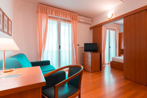TRIPLA JUNIOR: Camera di circa 22 mq, dotata di un letto matrimoniale e di un letto singolo. Dispone di balcone attrezzato con tavolo e sedie. Alcune Junior Suite possono disporre di un pratico angolo cottura a scomparsa, solo su richiesta all'atto della prenotazione e con supplemento. Pavimento in parquet.
