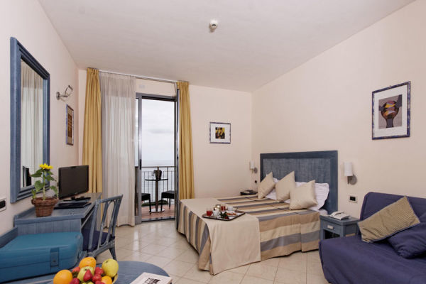 QUADRUPLA SUPERIOR BALCONE VISTA MARE: Camera con occupazione di minimo 3 persone e massimo 4, con una superficie di circa 23 mq, spaziosa e caratterizzata da arredi eleganti e divano letto, dispone di un balcone con vista mare.