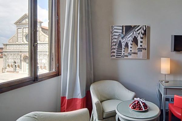 Superior con vista: sistemazioni con un ambiente contemporaneo e confortevole grazie ad una comoda zona notte dotata di letto matrimoniale, o due piazze singole, angolo studio con scrivania, salottino e perfino un camino (possibilità di aggiungere un terzo letto singolo).Carratteristica distintiva di questa tipologia di camere è la meravigliosa vista sulla bellissima piazza e sulla Chiesa di Santa Maria Novella, permettendo di entrare nell’atmosfera fiorentina.