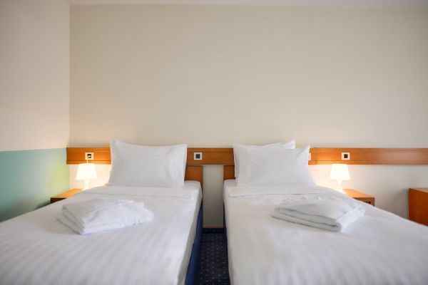 Camera doppia o matrimoniale: dispone di letti singoli 90 x 200 cm, unibili su richiesta, scrivania, aria condizionata, TV satellitare a schermo piatto e bagno con vasca. 25 mq.