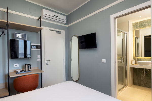 SINGOLA: Camera singola di circa 10 mq, arredata elegantemente.Dispone di bagno con vasca o doccia, telefono diretto, minibar, asciugacapelli, aria condizionata, wi-fi, Tv Sat, cassaforte.