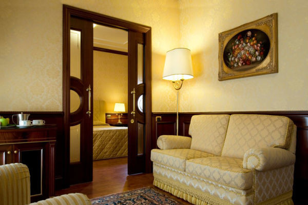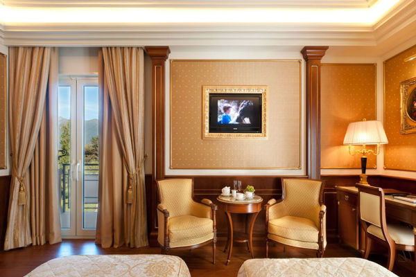 SENIOR SUITE VISTA LAGO: Suite con ambienti personalizzati nell'arredamento con tonalità di smeraldo o rubino, eleganti mobili d'epoca, un soggiorno, 1 camera da letto separata, un bagno in marmo con vasca idromassaggio e doccia ed una plendida vista sul Lago Maggiore. Dispone di bagno con doccia o vasca, cassaforte, wi-fi, telefono diretto, minibar, Tv Sat.