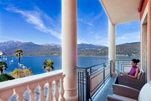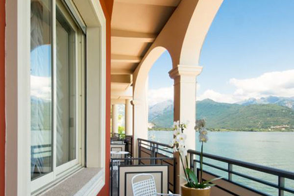 SUITE VISTA LAGO: Camera di circa 35 m², spaziosa con arredi raffinati. Dispone di un soggiorno, un bagno in marmo con vasca idromassaggio e doccia e una terrazza privata con splendida vista sul Lago Maggiore. Dotata di cassaforte, wi-fi, telefono diretto, minibar, Tv Sat, prodotti per il bagno in omaggio, accappatoio e ciabattine a disposizione.