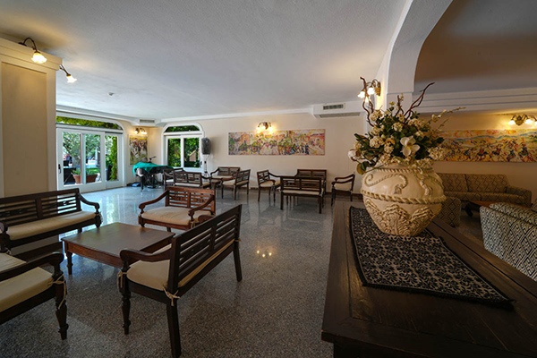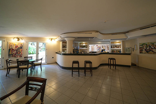 bar principale riparato da un portico, antistante un rigoglioso giardino, è ideale per snack e freschi drink. .