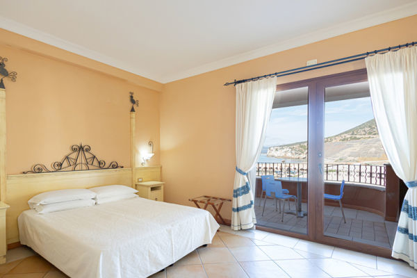 DOPPIA SUPERIOR: La camera superior (circa 20 mq), è dotata di balcone con vista mare, ed offre un piacevole panorama della costa sarda. Dispone di aria condizionata, minibar, balcone con vista mare, bidet, set cortesia, asciugacapelli, TV a schermo piatto, telefono, Wi-Fi, accappatoio e pantofoline.Questa tipologia è perfetta per famiglie o gruppi che vogliono godere del panorama in un ambiente più ampio.