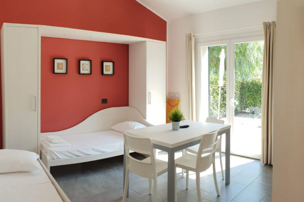 MONOLOCALE 4 PERSONE CON GIARDINO: Studio per 2 adulti e 2 bambini di circa 32 mq, con giardino, soggiorno con letto matrimoniale, divano letto con estraibile, armadio, appendiabiti, angolo cottura in ceramica, bagno con doccia, prodotti da bagno.