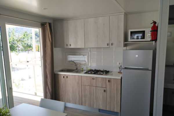MOBILHOME 4 PERSONE PEARL: Mobilhome per 2 adulti e 2 bambini, di circa 36 mq, incluso patio esterno attrezzato, giardino attrezzato, cucina, soggiorno con divano letto più estraibile, camera matrimoniale, bagno con doccia.
