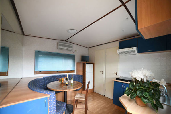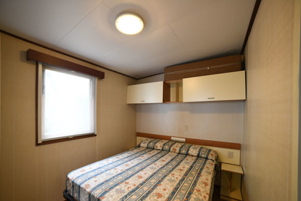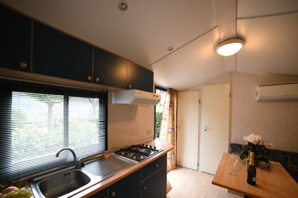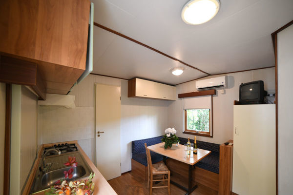 MOBILHOME - TIPOLOGIA B 4/5 PERSONE: Chalet-mobilhome per 4 persone e 1 bambino, di circa 24 mq. Composto da soggiorno con divano letto (cm 180) e angolo cottura dotato di fornelli a gas con 4 fuochi e frigorifero con congelatore, camera matrimoniale, camera doppia, bagno con doccia e WC, spazio esterno attrezzato. Aria condizionata e riscaldamento. Spazio esterno attrezzato con sedie o panche più tavolo. Posteggio riservato di fianco alla struttura.