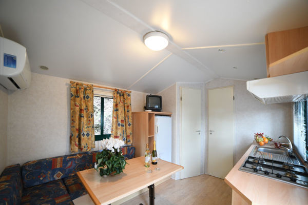 MOBILHOME B 2/3 PERSONE: Chalet-mobilhome per 2 persone e 1 bambino, di circa 24 mq. Composto da soggiorno con divano letto (cm 180) e angolo cottura dotato di fornelli a gas con 4 fuochi e frigorifero con congelatore, camera matrimoniale, camera doppia, bagno con doccia e WC, spazio esterno attrezzato. Aria condizionata e riscaldamento. Spazio esterno attrezzato con sedie o panche piu tavolo. Posteggio riservato di fianco alla struttura.