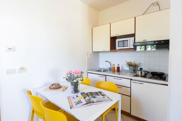 Il bilocale, di 33 mq, è la soluzione perfetta per gruppi e famiglie (progettato per ospitare fino a 5 persone). Si compone di un letto matrimoniale e divano letto e di angolo cottura con microonde.