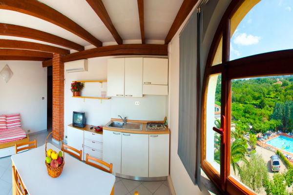 Il Residence Pian dei Boschi è la struttura ideale per chi ama il mare, la natura e la libertà. L' atmosfera è quella tipica del villaggio vacanze, ci si può rilassare e divertire in famiglia, con gli amici o in coppia, godendo sia della natura che della vicinanza al mare. In prossimità dei più rinomati percorsi per mountain bike, trekking e arrampicata, soddisfa anche le esigenze dei più sportivi. All'interno dell'area del villaggio, divisa in due palazzine, si trovano appartamenti monolocali e bilocali completamente arredati e dotati di vari comfort, con terrazza/balcone o giardino. Una delle palazzine è fornita di ascensore ed in posizione comoda, vicino a tutti i servizi (piscina, ristorante, bar completamente rinnovato, pizzeria, area fitness e Reception). L'altra è ubicata in posizione centrale con vista sulla piscina e dispone di appartamenti bilocali con giardino ed altri con terrazza, attrezzati di tavoli e sedie. Gli appartamenti dispongono di doccia, credenza con fornello (gas o induzione, 3/4 fuochi), frigo, Tv Led, cassaforte, balcone o spazio esterno attrezzato. Alcuni appartamenti hanno aria condizionata, gratuita da riservare al momento della prenotazione. La tipologia mobil home è una casa mobile confortevole, funzionale e arredata con cura, dotata di 2 camere da letto, una matrimoniale e una con 2 letti singoli, servizi con box doccia, soggiorno con angolo cottura completamente arredato. All'esterno veranda in legno fornita di tavolo e sedie che da la possibilità agli ospiti di mangiare nel verde. Gli appartamenti sono dislocati in varie posizioni all'interno del campeggio.