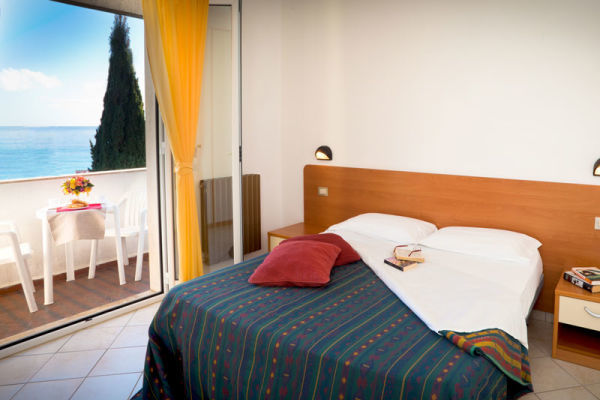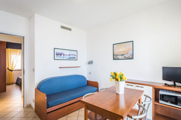 BILOCALE COMFORT 5 PERSONE: Bilocale per 5 persone, di circa 35 mq, composto da camera matrimoniale e letto singolo, soggiorno con divano letto doppio e angolo cottura, servizi con vasca da bagno o doccia, balcone attrezzato (1 ombrellone e 1 sdraio) con vista mare. Questa tipologia di camera inoltre è dotata di lavastoviglie ed aria condizionata.