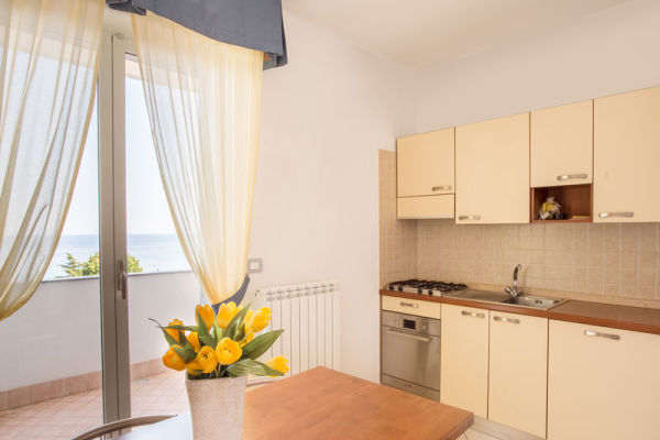 BILOCALE CLASSIC 5 PERSONE: Bilocale per 5 persone, di circa 35 mq, composto da camera matrimoniale e letto singolo, soggiorno con divano letto doppio e angolo cottura, servizi con vasca da bagno o doccia. Balcone attrezzato con vista mare.