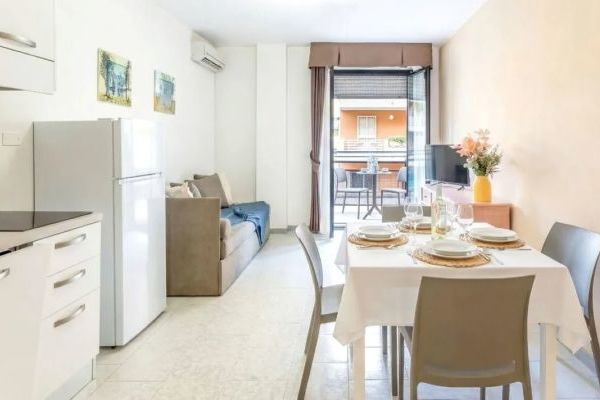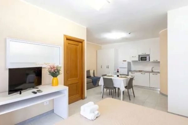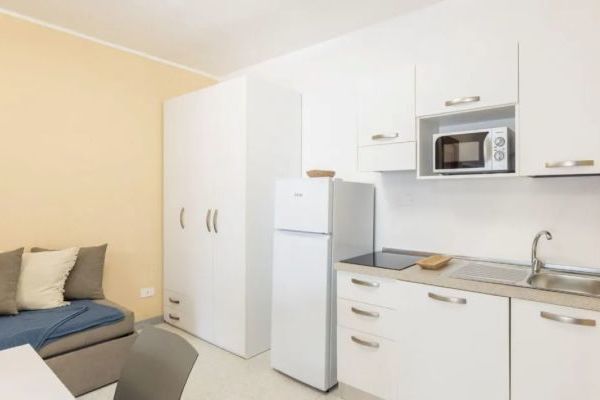 Monolocale: 38 mq, può ospitare due persone. Presenta un soggiorno con angolo cottura, letto matrimoniale (letti separabili) e bagno con doccia.
