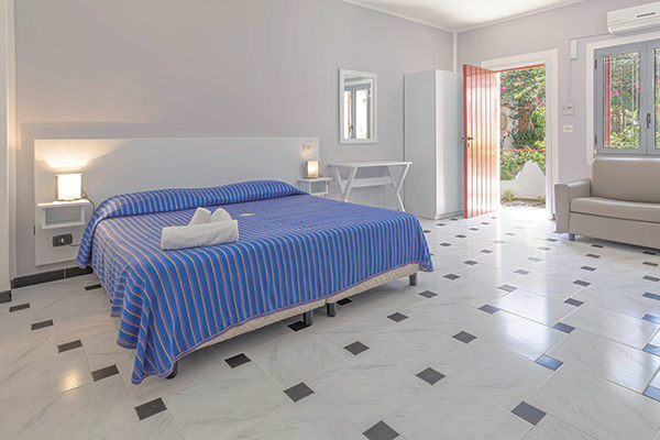 37 Camere Standard, unico vano, in grado di ospitare da 2 a 3 persone (disponibili camere standard 5 posti letto), sono dotate di: aria condizionata, servizi con doccia e phon, tv, frigo, quasi tutte al piano terra con patio e qualcuna al primo piano con balcone. Family Room: 77 appartamenti in formula hotel con servizi privati, phon, Tv, frigo e veranda. Sono disponibili nella seguente tipologia: Bilocali 4 posti Family Room con vano soggiorno, camera matrimoniale, camera doppia con letti piani o letto a castello. Situati a piano terra o primo piano. Disponibili camere per disabili. Possibilità di 5° letto su richiesta in camera standard. Cambio biancheria: Biancheria da bagno: cambio domenica/martedì/giovedì, richiesta cambio supplementare Euro 15 a persona (tris di asciugamani). Biancheria da letto: cambio mercoledì e giovedì, richiesta cambio supplementare Euro 15 letto matrimoniale – Euro 10 letto singolo.