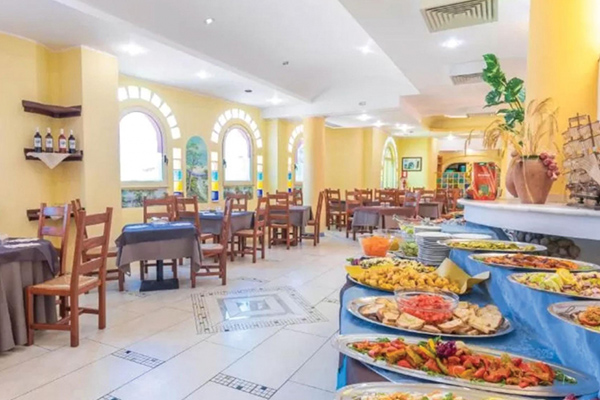 Ristorazione: Tavolo pre-assegnato (con eventuale riempimento con altre persone) e servizio a buffet. Trattamento in Soft All Inclusive: Pensione completa con bevande incluse. American hot buffet breakfast: 07:30 – 09:30 coffee, tea, cioccolata, orzo, cappuccino, crema di yogurt; confetture e marmellate vari gusti; succhi di frutta alla spina, crema al cacao, miele, fette biscottate, frollini; panini, pane tostato, formaggio, salumi, uova soda, uova strapazzate + ad alternanza bacon o wurstel; cereali vari; plum-cake, crostate di marmellata e crostate di cioccolato, torte varie, brioches; croissant. Pranzo: 12:30 – 14:00 a buffet a base di pesce e carne tutti i giorni con antipasti vari, insalate, verdure e contorni; 3 primi piatti; 2 secondi a base di pesce e carne; frutta fresca. Cena: 19:30 – 21:00 a buffet a base di carne e pesce con antipasti vari, insalate, verdure e contorni; 3 primi + 1 zuppa; 2 secondi a base di pesce e carne; frutta fresca + dolce. Bevande incluse: in sala ristorante, durante servizi di pranzo e cena: acqua microfiltrata, naturale e frizzante, in caraffa; vino della casa in caraffa; soft drink (spinati); birra alla spina.