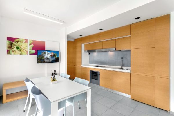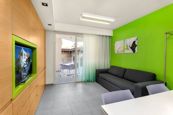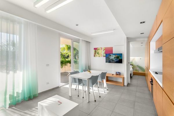 SUITE CON 1 CAMERA: è un’opzione ideale per chi desidera un soggiorno in un ambiente spazioso e funzionale. Con i suoi 30 metri quadrati, offre la comodità di un mini appartamento, composto da una camera matrimoniale e un’area giorno con cucina.