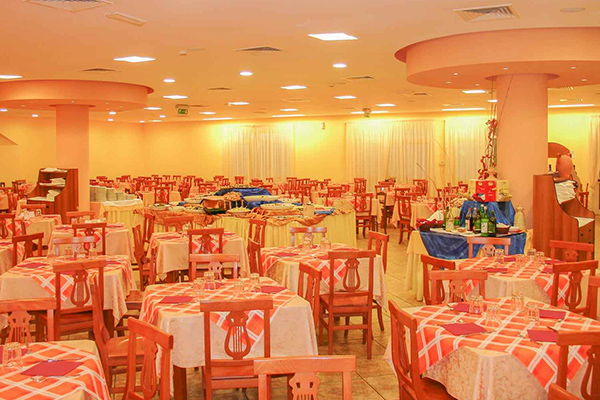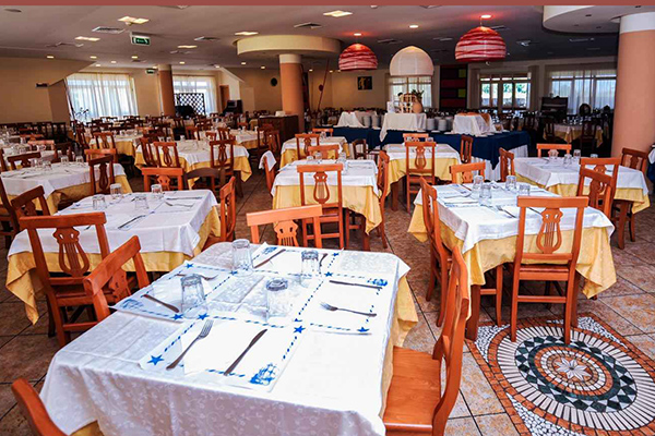 Ristorazione: A disposizione dei clienti una sala ristorante con tavoli assegnati, climatizzata e pasti con buffet servito, anche con piatti tipici della cucina locale e mediterranea e pasta fresca fatta in casa, scelta tra due primi e due secondi, buffet di contorni; griglieria a pranzo e cena (si intende, uno dei due Secondi in menù è cucinato alla griglia); pizzeria napoletana, sempre a buffet (solo per la cena). Frutta, gelato a pranzo, dolce e frutta la sera. Lunedì sera e mercoledì piatto a sorpresa. Per i bimbi del miniclub merenda pomeridiana in compagnia dello staff di animazione.