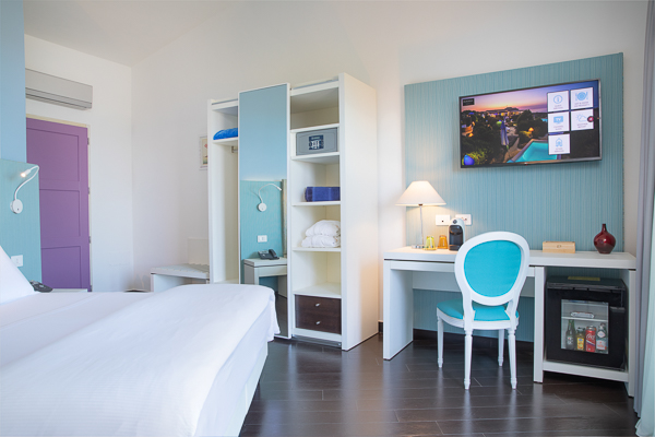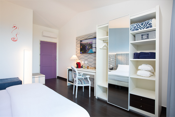 Le camere dispongono di balcone vista mare, servizi privati, asciugacapelli, aria condizionata (gratuita), minibar (a pagamento), telefono, Tv e Wi-Fi (gratuito).