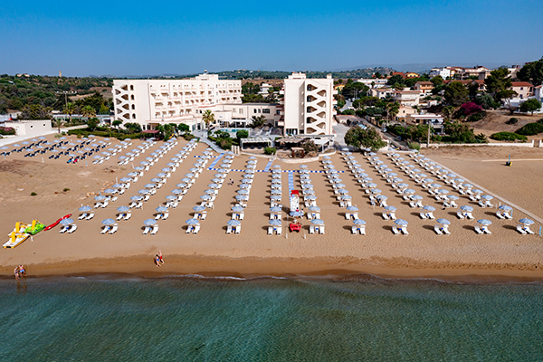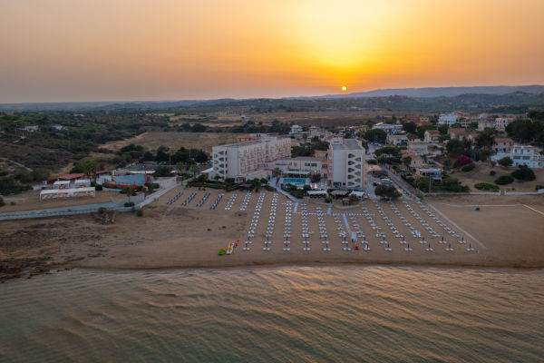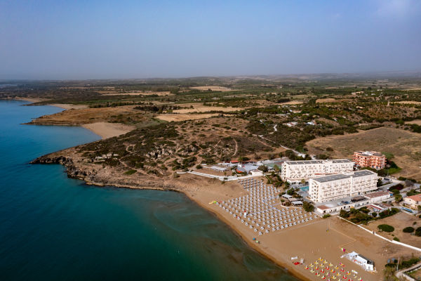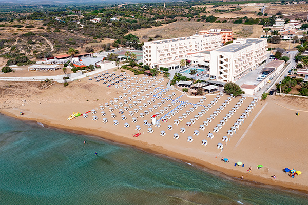 Ampia spiaggia di sabbia dorata con accesso diretto dalla struttura, attrezzata con lettini ed ombrelloni a disposizione degli ospiti. All'interno di una piccola baia, con fondale degradante, particolarmente adatta per i bambini. Possibilità di noleggio teli mare.