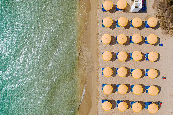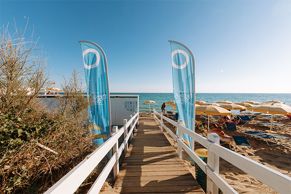 Di sabbia fine, insignita della Bandiera Blu 2024, con lido privato e attrezzato con ombrelloni e lettini a circa 150 metri, raggiungibile a piedi percorrendo la zona servizi e attraversando una stradina secondaria sterrata che costeggia il litorale. A 50 metri, oltre la duna all'interno della struttura, beach bar, docce e servizi igienici. Disponibilità di sedia Job per ospiti con difficoltà motorie.