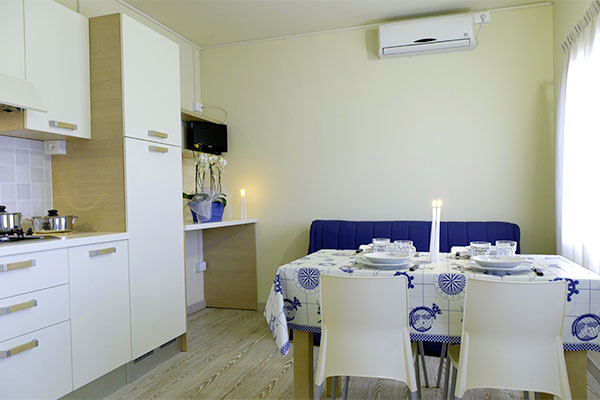 Le sistemazioni sono dotate di servizi privati, aria condizionata (gratuita per 10 ore al giorno), riscaldamento (gratuito per 10 ore al giorno), angolo cottura, fornello elettrico o a gas, frigorifero, microonde, prima fornitura di biancheria da letto e Tv. Gli Chalet Comfort Dog sono di 36 mq e dispongono di una camera matrimoniale e una camera con letti a castello; i Lodge Comfort Plus sono di 30 mq e sono composti da soggiorno con divano letto singolo, una camera da letto matrimoniale e una camera con letti singoli.